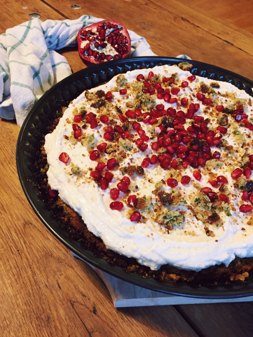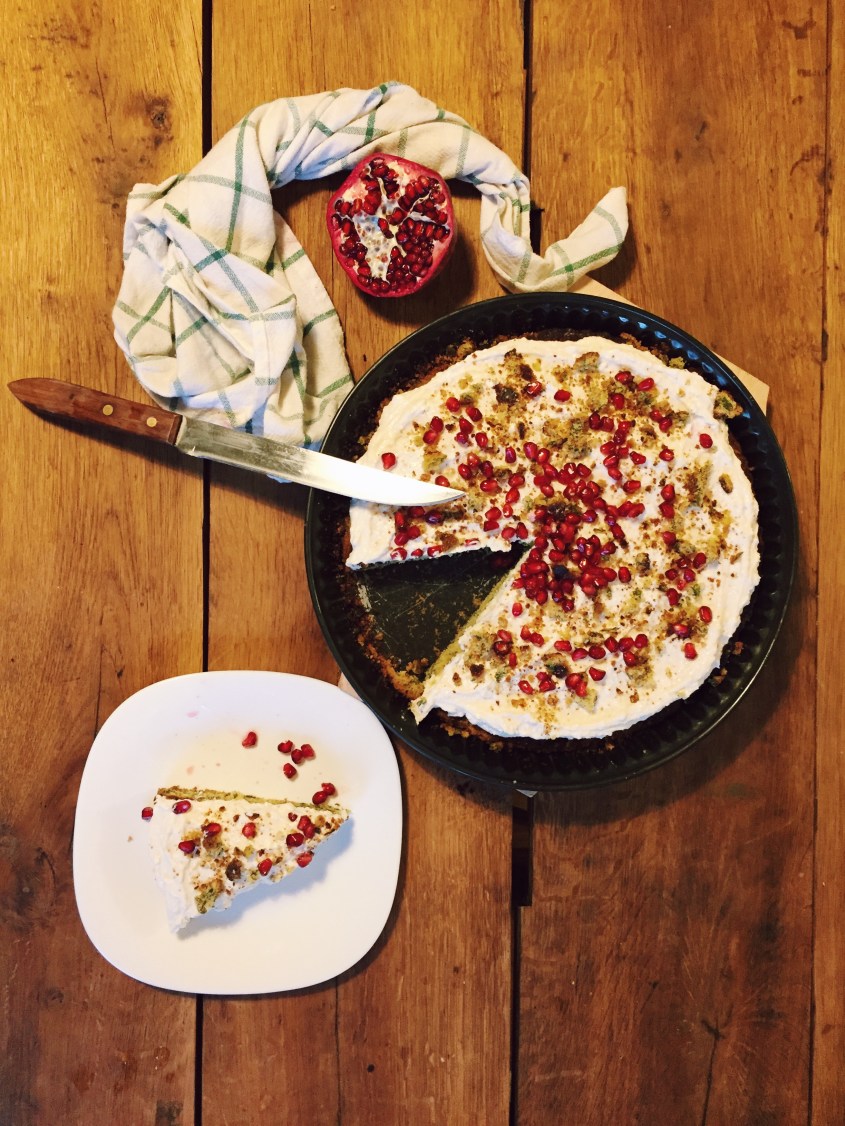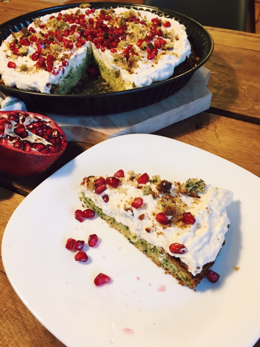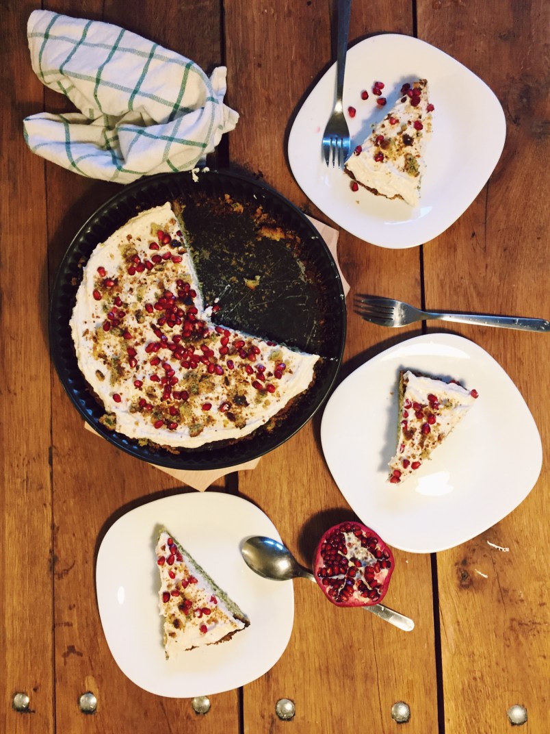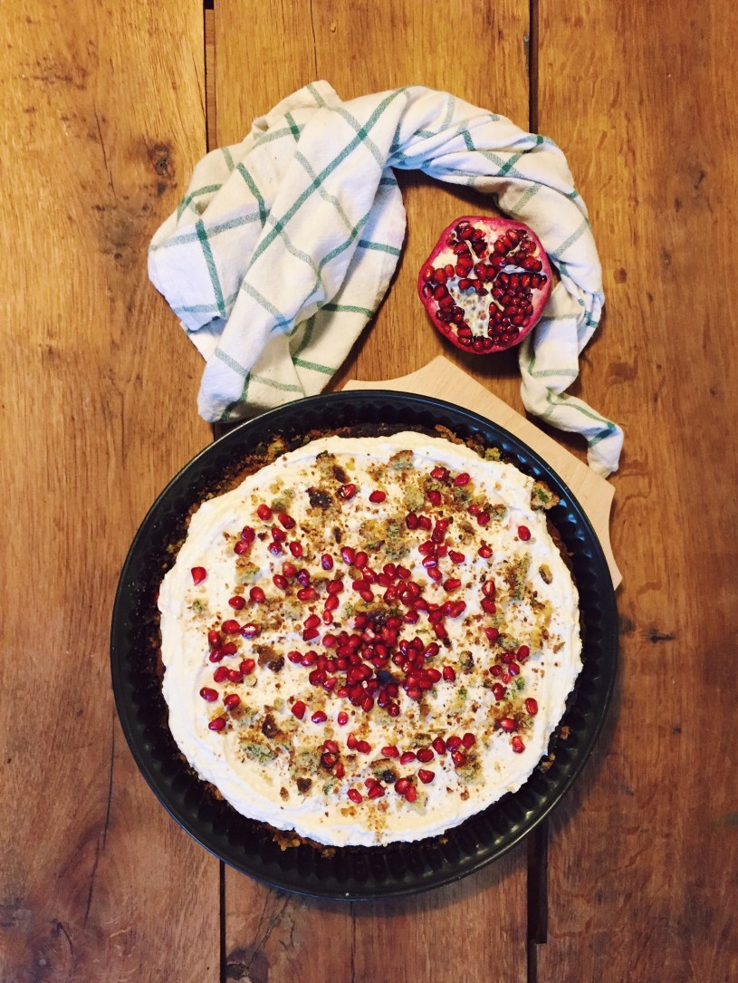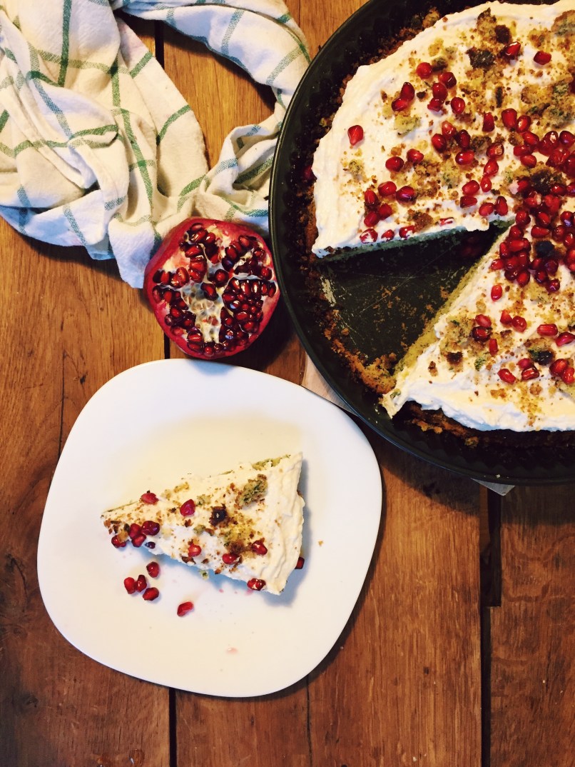 For the cream, mix the mascarpone, the fresh cheese, the lemon juice and the sugar until just combined, and place it on the cake. On the top, put the pomegranate seeds and the crunched cake top that you previously cut.