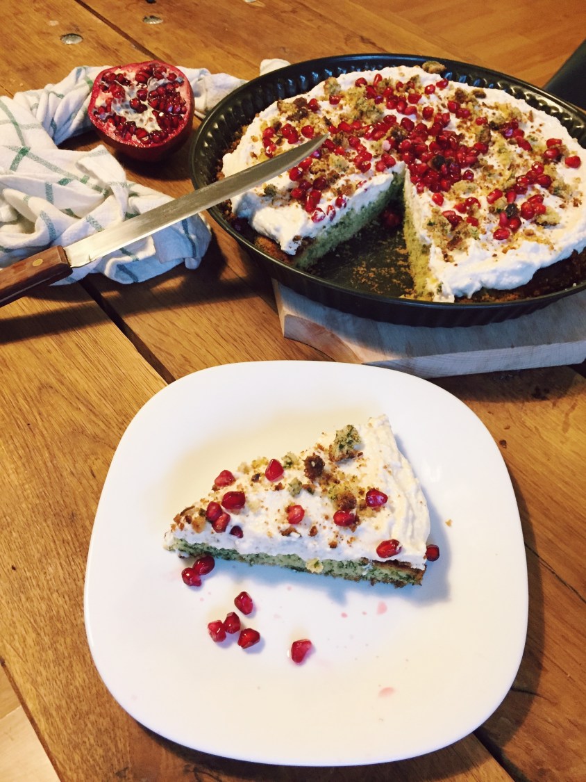 Prima oară am mâncat prăjitura din care a rezultat această rețetă când eram în Budapesta. Aneta, prietena mea din Polonia o gătise pentru noua ei colegă de apartament, Teo, și am gustat și eu din ea. Țin minte că ne-a adus o bucată din prăjitură la pachet, într-o drumeție pe ceva deal din împrejurimile Budapestei; ploua, nu găseam drumul bun, am ajuns de 5 ori în același loc, și când am ajuns sus, la turnul pe care îl căutasem atâtea ore, am stat 10 minute și ne-am întors, pentru că începea să se întunece. Ce e amuzant este că ea a adus o caserolă mică pe care urma să o împărțim, dar de când am luat prima îmbucătură am știut că restul nu aveau să mai primească, oricum. Am întrebat-o cu ce era – era verde – și mi-a spus „cu spanac”. Mi-am dat seama de reacția pe care am avut-o atunci, numai în momentul în care am dat acest detaliu, la rândul meu, prietenilor care m-au întrebat, în timp ce mâncau din prăjitură.