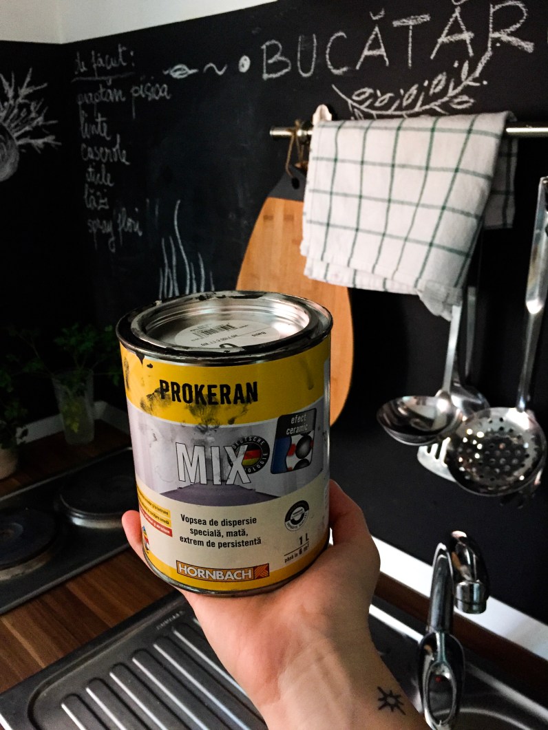 – vopsea lavabilă neagră de la Hornbach – 45 de lei cutia, iar eu am folosit o cutie (am făcut chenarul din bandă adezivă, iar apoi am vopsit în două straturi, lăsând vreo 2 ore să se usuce între straturi)