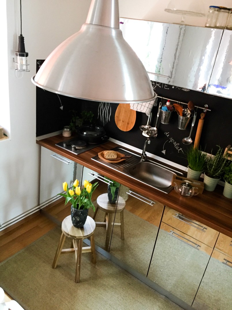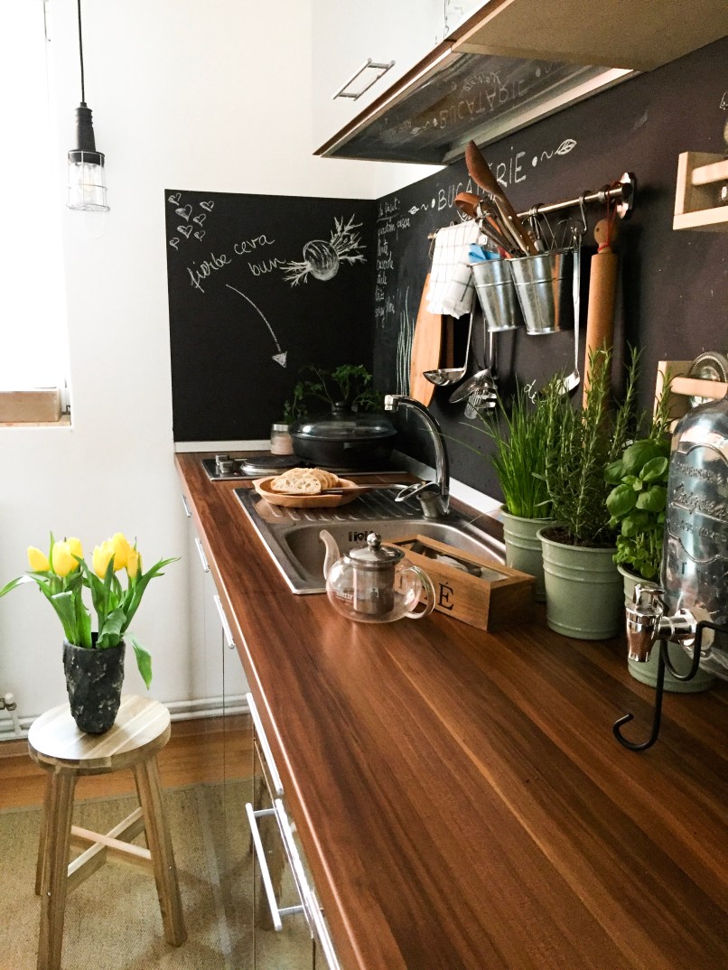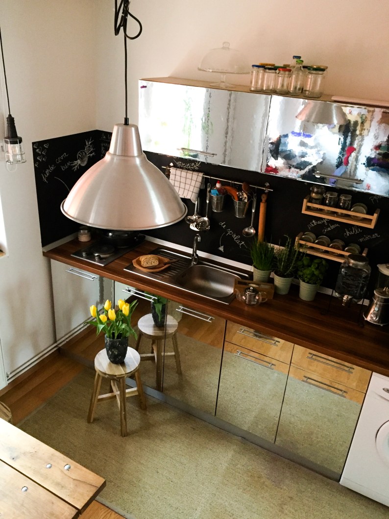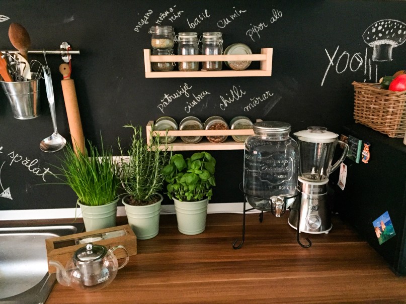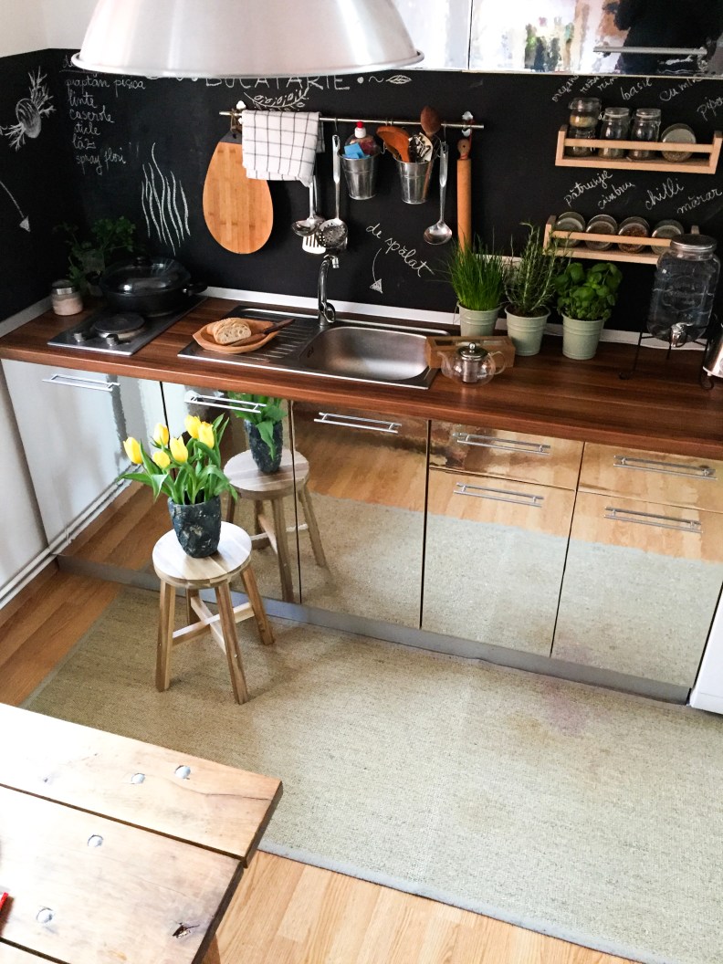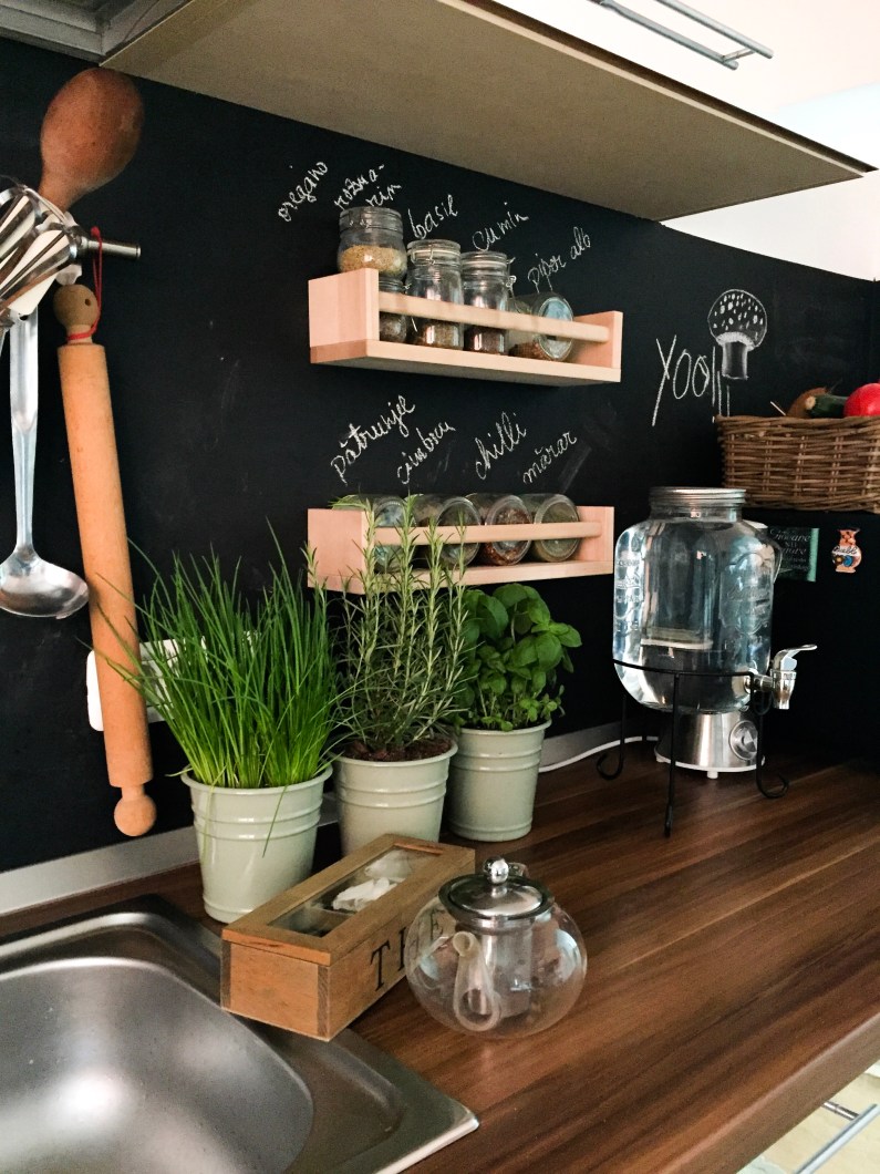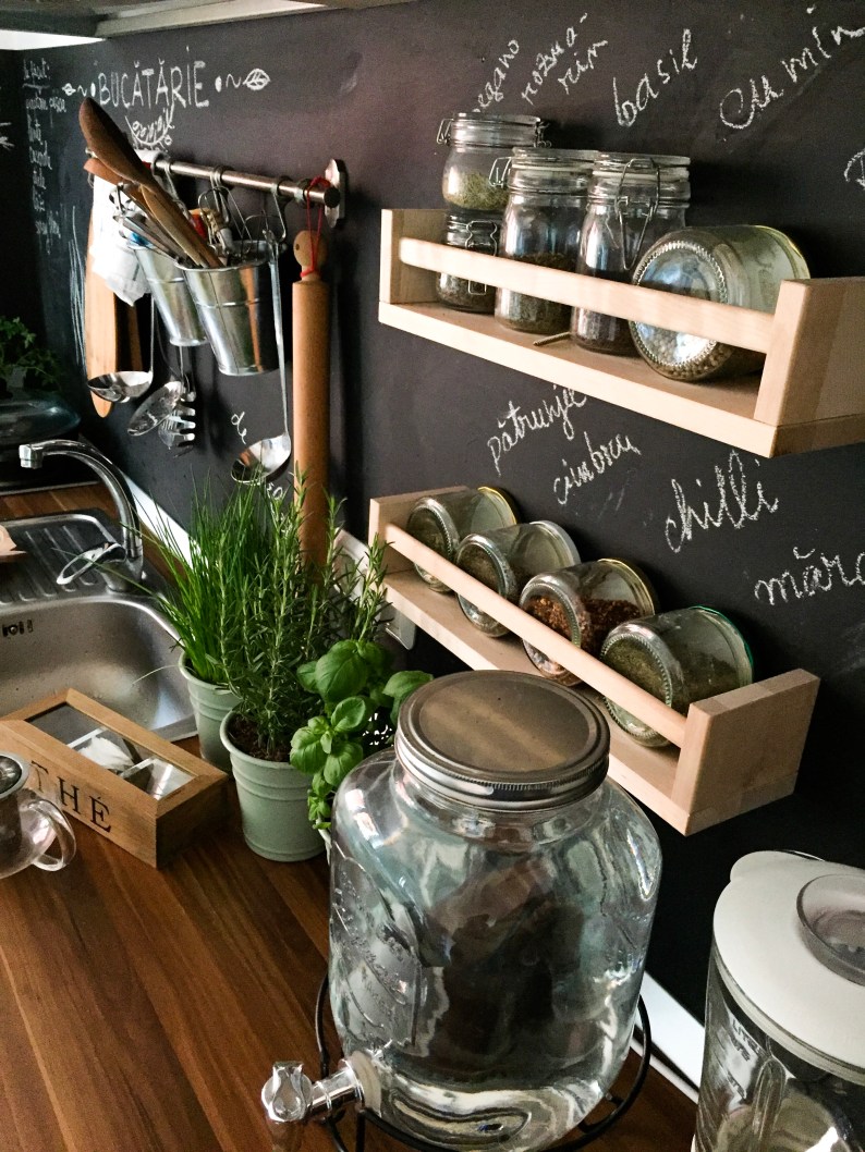 EN: I am really happy with the result! Now I have a blackboard where I can write down my shopping list or a lot of other stuff, I have a bar where I can store various useful kitchen tools, and I have a special storage place for spices. I basically used the vertical space for the storage of the things that would have taken a lot of spaces if they were inside the kitchen cabinet or on the counter top.