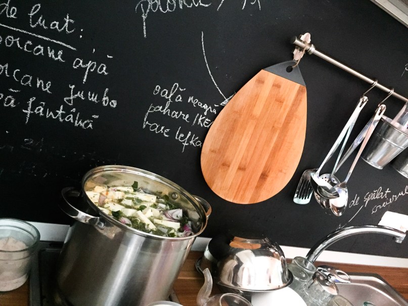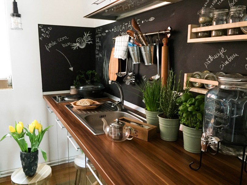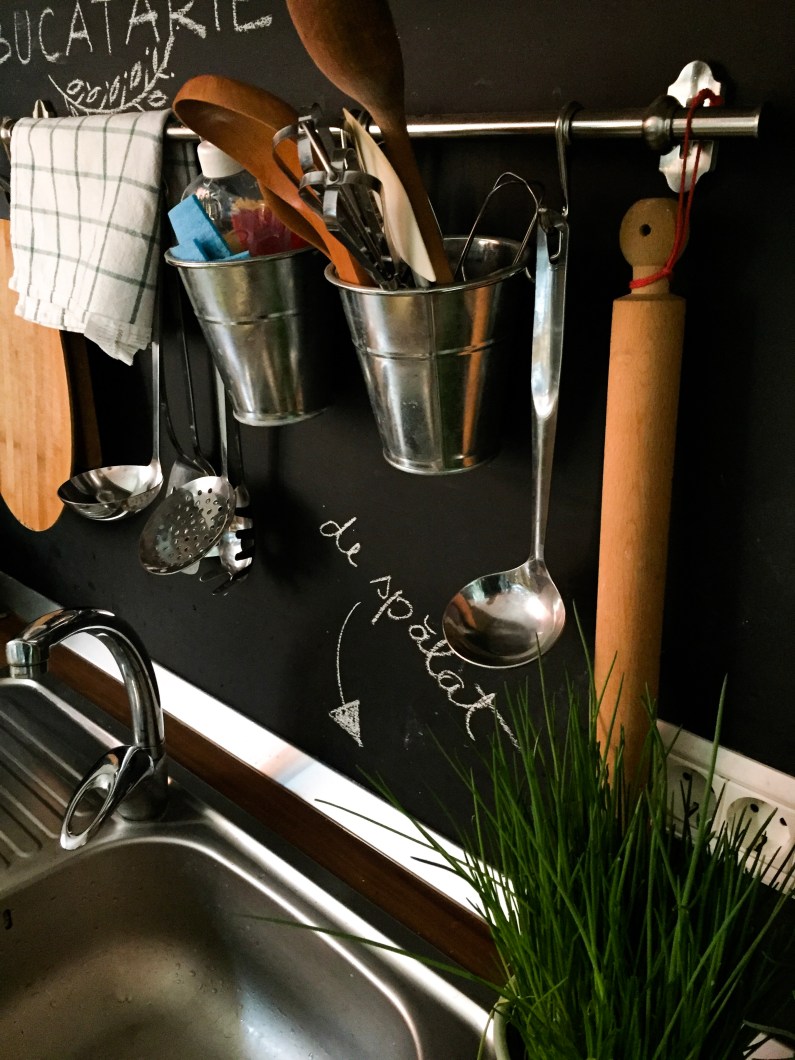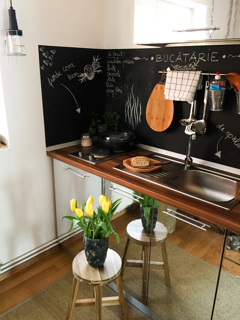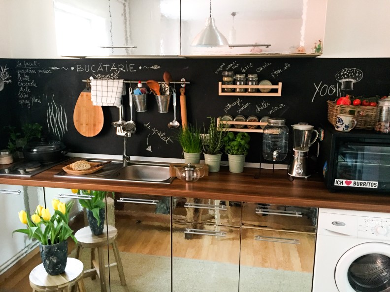 Eu sunt foarte mulțumită de ce a ieșit! Acum am o tablă pe care pot să scriu lista de cumpărături sau o grămadă de alte lucruri, am o bară cu cârlige și ghivece unde pot să atârn sau să depozitez multe ustensile uzuale (polonic, tocător de lemn, burete și detergent), și am loc special pentru mirodenii. Am folosit, practic, spațiul vertical pentru depozitarea obiectelor care ar fi ocupat mult loc prin dulapuri sau pe pult.