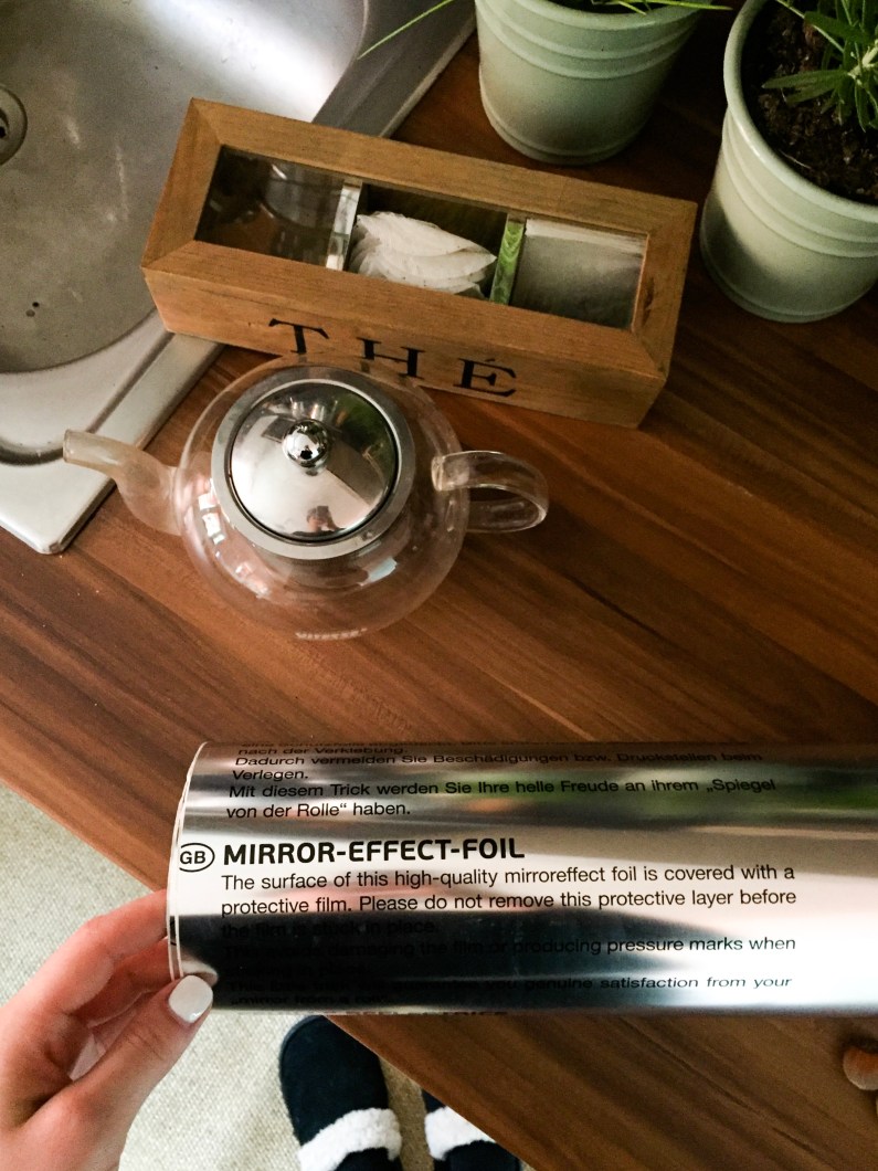 – folie adeziva cu reflexe metalice, tot de la Hornbach – 39 de lei sulul, iar eu am folosit 3 suluri (am dat jos mânerele dulapurilor și am lipit cu ajutorul unui tel mare de lemn; excesul de folie l-am tăiat ulterior cu cutter-ul)