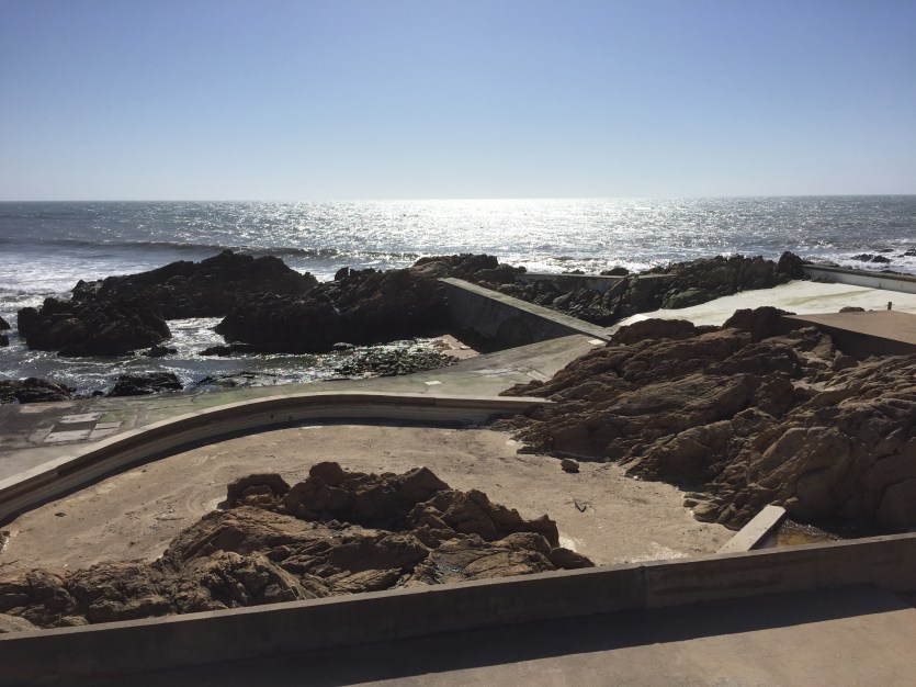 Leça da Palmeira – Sunt niște piscine care arată foarte mișto, chiar pe malul oceanului, înconjurate de stânci și valuri sparte, realizate de celebrul arhitect portughez Álvaro Siza. Din pozele de pe net arată ca și cum există și un deal / munte / ceva înalt prin apropiere, unde poți să te cațeri într-o plimbare de dimineață și să privești toate astea, deci părea un loc minunat. Atâta doar, că pe net nu am gasit nimic referitor la lunile de funcționare ale piscinelor, așa că în luna aprilie erau goale. În plus, nu-i nici un munte prin apropiere, deci poza pe care am luat-o de pe net (de mai jos), este aproape o minciună: