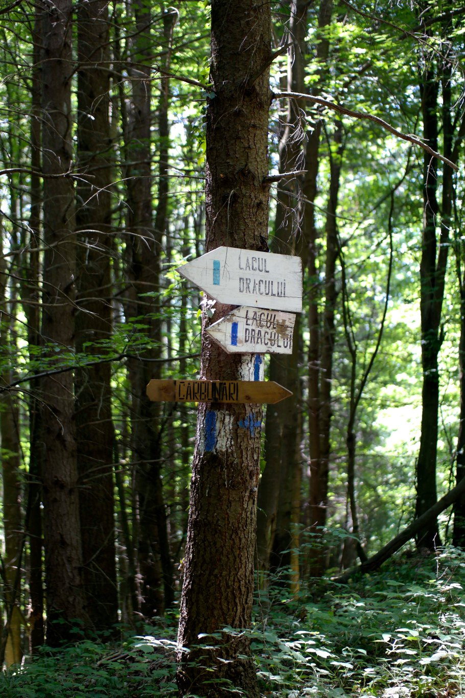 Din Satul Cărbunari se poate continua cu mașina până când drumul se bifurcă și întâlniți indicatoarele de mai jos. Cred că în condiții bune, drumul e accesibil pentru mașini și în continuare, pentru încă vreo 2 km, dar noi am preferat să începem de aici. Din nou, pe tăblițe scrie 1,5 ore, dar noi am făcut aproape 3 ca să ajungem la Lacul Dracului. În orice caz, traseul este superb, trecând înițial printr-o pădure, apoi ieșind pe un platou deasupra dealurilor, urmând să intre din nou într-o pădure puțin mai greu accesibilă și cu o pantă destul de abruptă. Aici au început să intervină probleme de viață și de moarte, pentru că mie mi se părea că aud respirația unui urs (!!!). Știu, știu, nu există urși (și chiar nu există) la o altitudine atât de joasă, și, cu atât mai mult, nu a mai auzit nimeni de urși în Banat. Dar chestia asta poate fi măcar o dovadă că locul este foarte frumos și sălbatic, iar traseul atât de pitoresc (că ai impresia că o să te mănânce ursul).