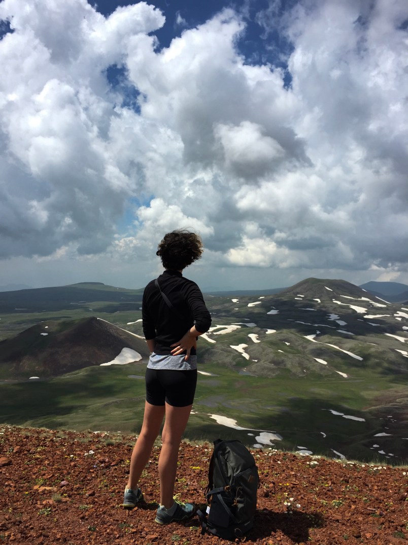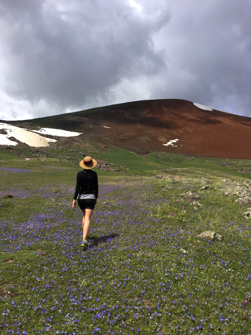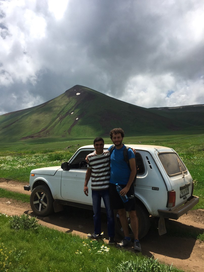 VAI. DE. MINE. Asta a fost cea mai frumoasă experiență pe care am avut-o în toată vacanța. Am pornit pe jos pe un drum (în sus), pe care am sperat noi să îl facem în vreo 3 ore. Nu știu cât ne-ar fi luat pe jos, dar cert este că după două ore, rupți de oboseală și căldură, morți de sete și nevăzând nicăieri vreo urmă a muntelui căutat, s-a oprit să ne ia un tip cu o Lada Niva. Am mai mers cu el încă vreo două ore (cu mașina), deci pe jos… nu știu cum ar fi fost. Dar am avut noroc! Omul a fost super de treabă, ne-a servit cu fructe din proviziile pe care le ducea pentru familia lui (care locuia într-o așezare de 3 corturi la 3200 de metri), și ne-a povestit, practic, toată viața lui. Nu vorbea engleză (și nici noi armeană), dar cumva cumva, ne-am înțeles.