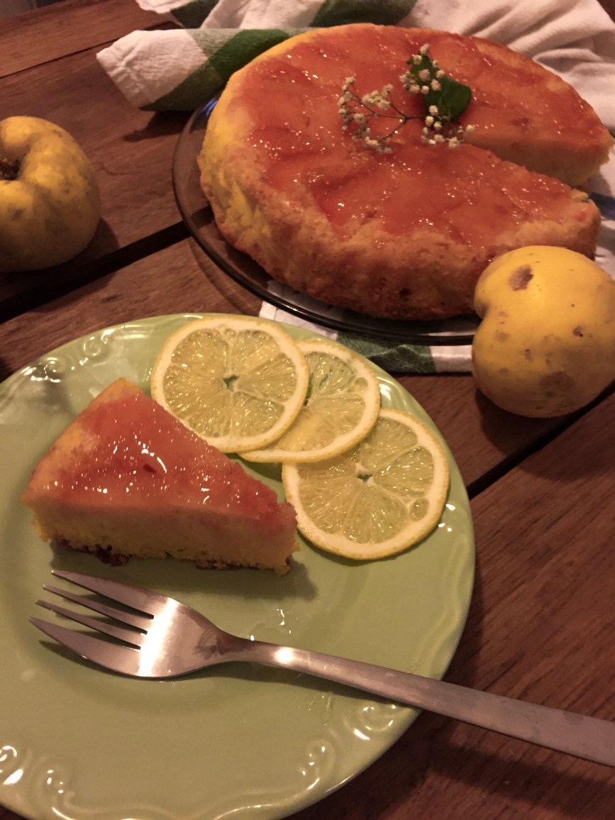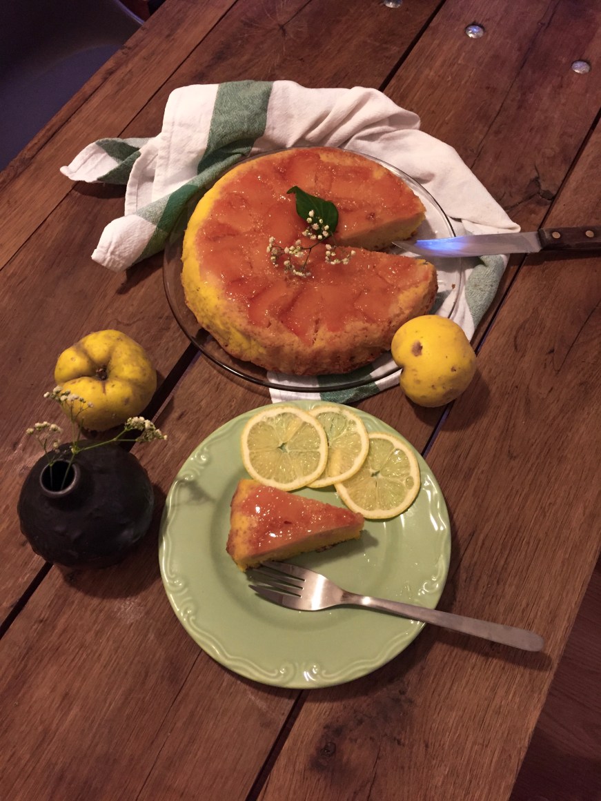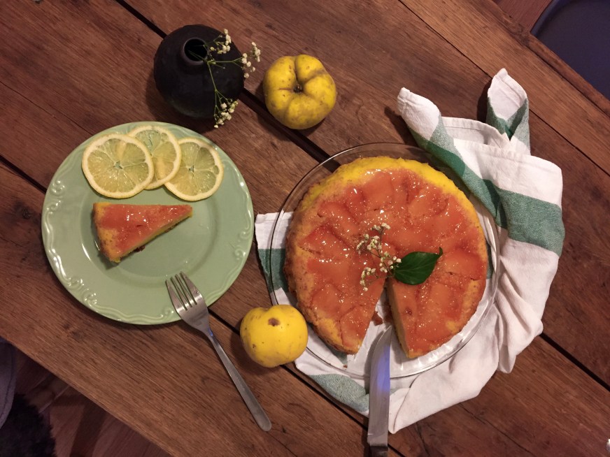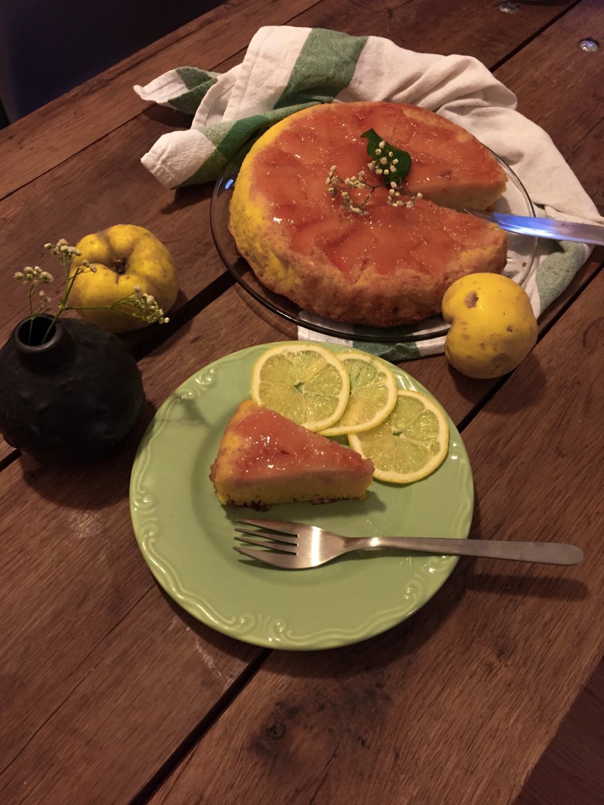 Am pus glazura deoparte, și am trecut la aranjarea tăvii pentru copt. După ce pui hârtia de copt într-o tavă (cu diametrul de aproximativ 25 de centimetri), trebuie să așezi gutuile (într-un mod cât mai drăguț). Ultimul, și cel mai simplu lucru pe care trebuie să îl faci este să torni aluatul peste și să pui tava la copt pentru vreo 40-45 de minute.