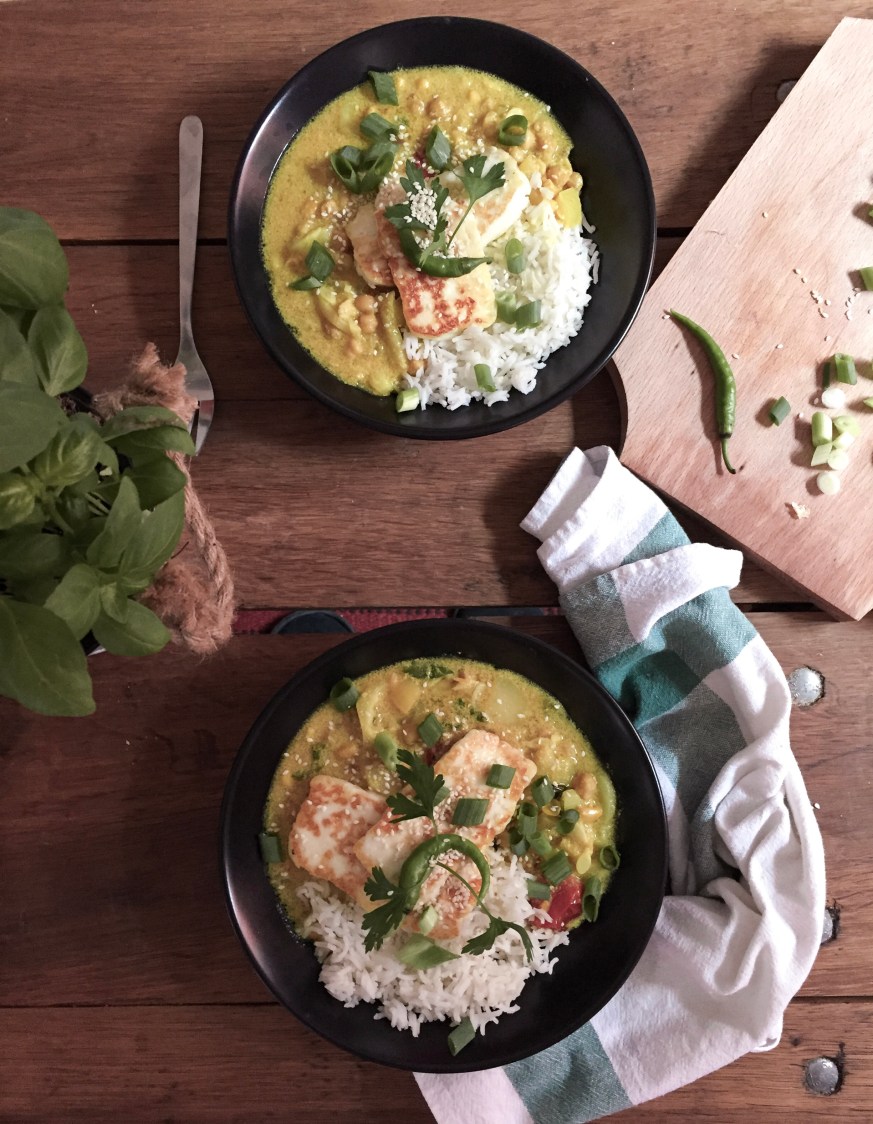 În timp ce toate astea mai fierb la foc mic câteva minute, taie felii halloumi-ul și prăjește-l într-o tigaie cu puțin ulei de măsline. Nu sunt în măsură să dau prea multe indicații în ceea ce privește prăjitul brânzei (am avut foarte multe tentative eșuate și doar cu brânza halloumi mă pot înțelege), dar în principiu, focul trebuie să fie puțin mai mare decât mediu, și brânza trebuie verificată ca să nu se prindă de tigaie.
