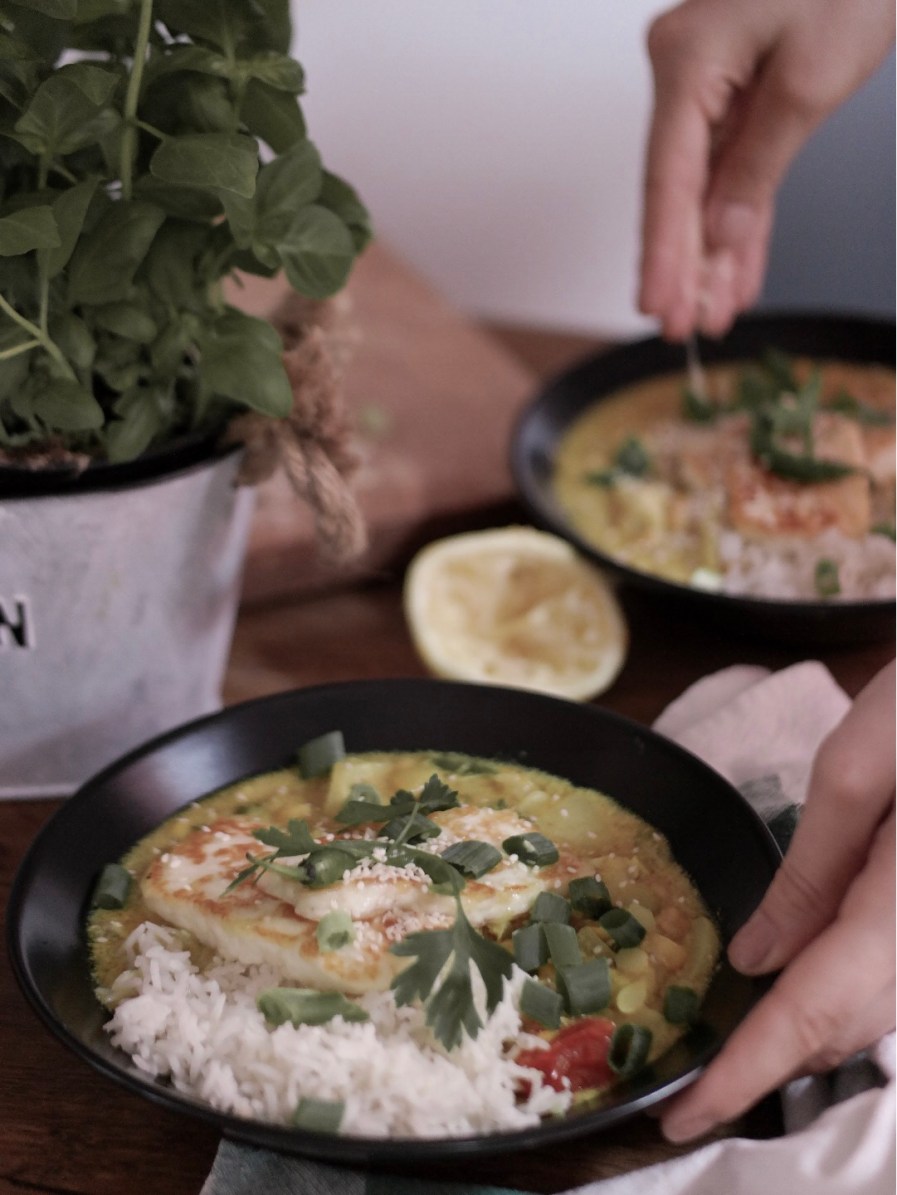 Pasul următor este formarea sosului propriu-zis, și anume adăugarea laptelui de cocos, tahini-ului și a curry-ului. În loc de tahini se poate folosi și unt de arahide sau orice altă pastă de semințe, dar se poate și elimina complet (eu zic că îi dă un gust foarte bun, dar nu lăsați baltă rețeta asta dacă vă e greu să îl găsiți – pasta de tahini nu se găsește peste tot, asta e sigur).