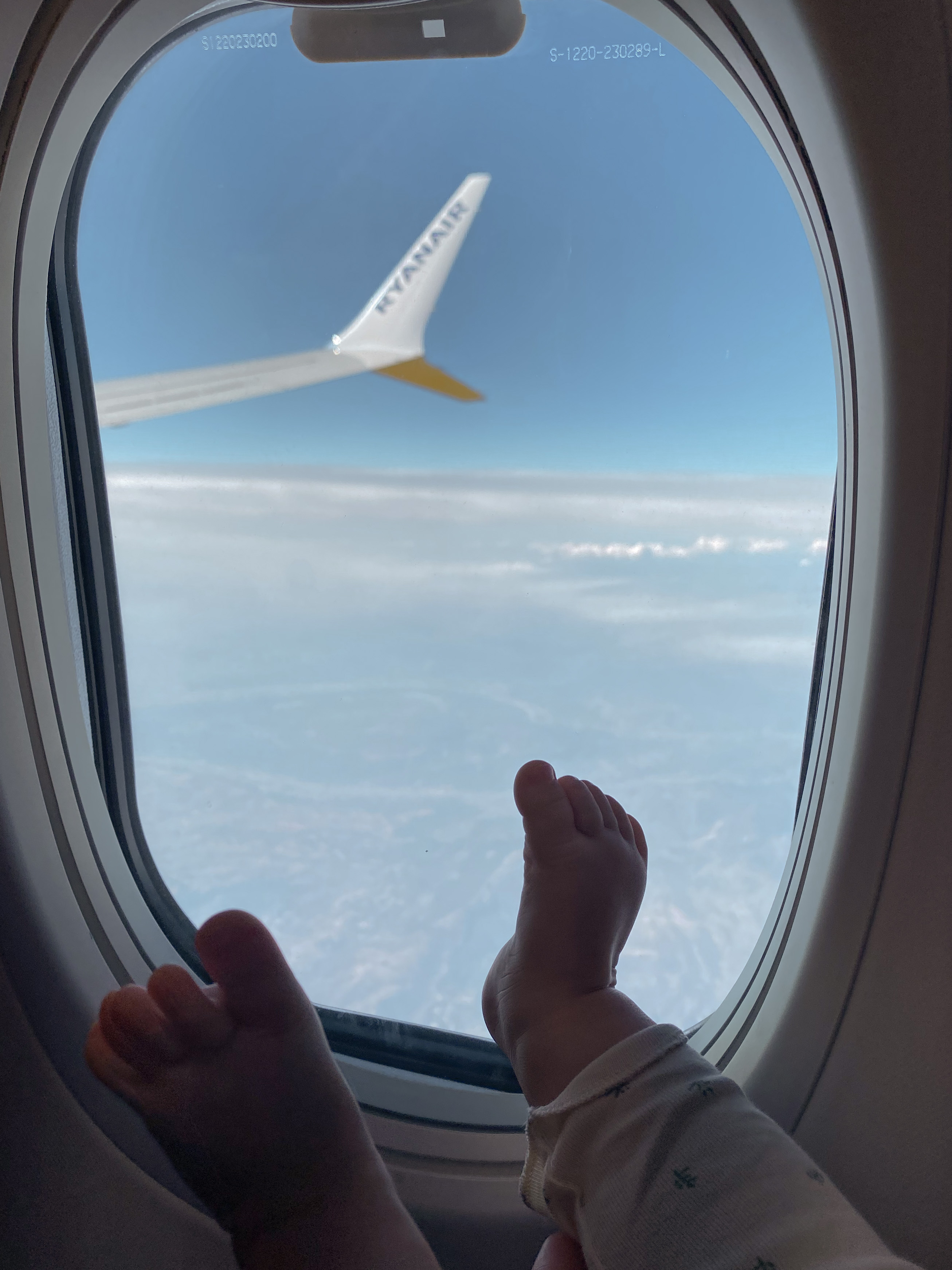 Pe zborurile low-cost, ai voie să iei cu tine gratuit (de fapt, e contra acelei taxe pentru infant) două piese pentru bebeluș. Aceste piese pot fi ori un cărucior și o scoică, ori două cărucioare, ori un cărucior format din două piese, cum a fost cazul nostru (atunci aveam căruciorul Cybex Balios S, cu care am călătorit ok, dar nu pot să spun că a fost incredibil de ușor, și în mod cert nu m-aș fi descurcat singură pe zbor – cu copil, bagaje, și un cărucior din două piese).